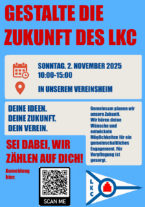 | Bemerkungen: | Zukunft des LKCDeine Ideen. Deine Zukunft. Dein Verein.Gemeinsam planen wir unsere Zukunft. Wir hören deine Wünsche und entwickeln Möglichkeiten für gemeinschaftliches Engagement.