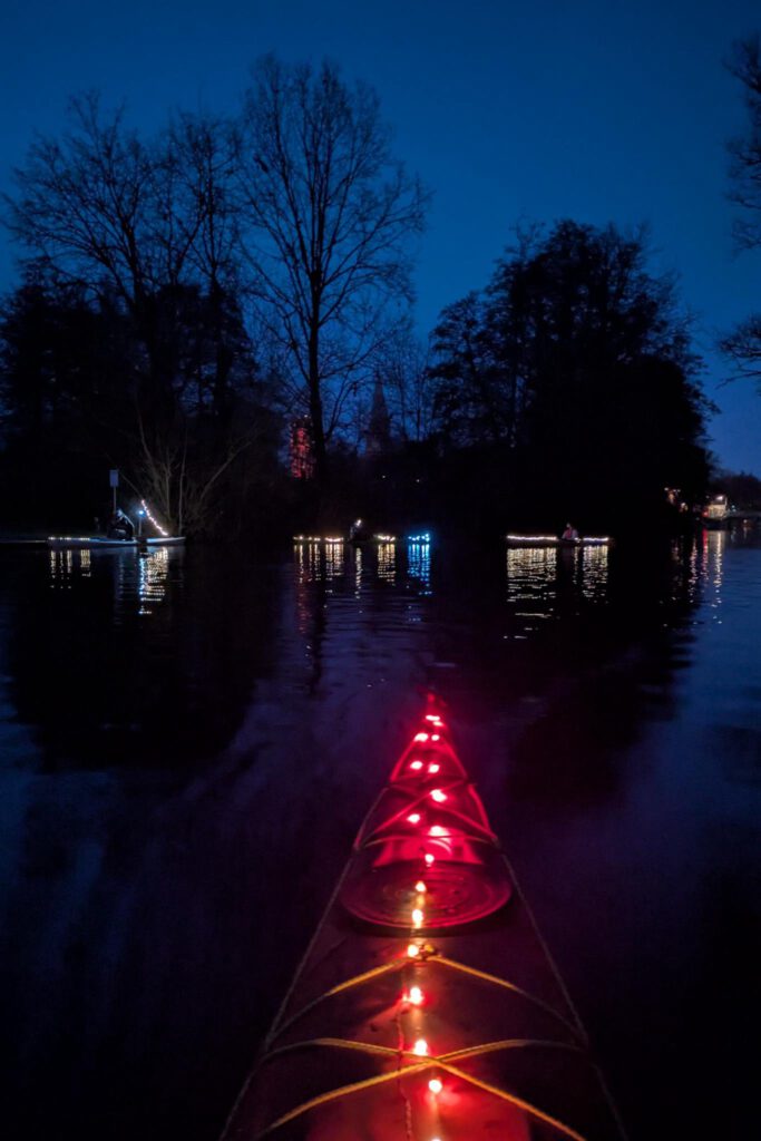 Gemeinsam starteten wir am Bootshaus und paddelten die Ilmenau entlang. Mit einem kurzen Umtragen am Lösegrabenwehr ging es weiter bis zum Stint – begleitet von Lichterglanz und vielen neugierigen Blicken vom Ufer.